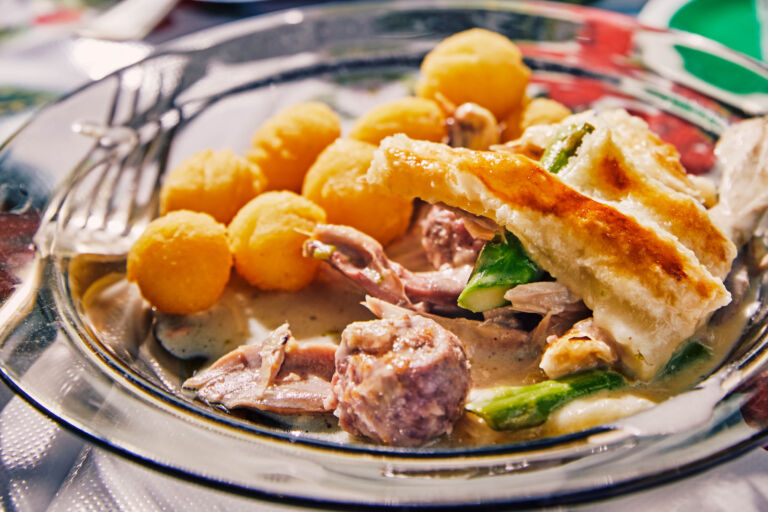 Roll balls from the minced meat and cook for 1 minute in the broth. Remove them and place them with the guinea fowl meat. Strain the broth now, let it rest for five minutes, and skim off the fat.