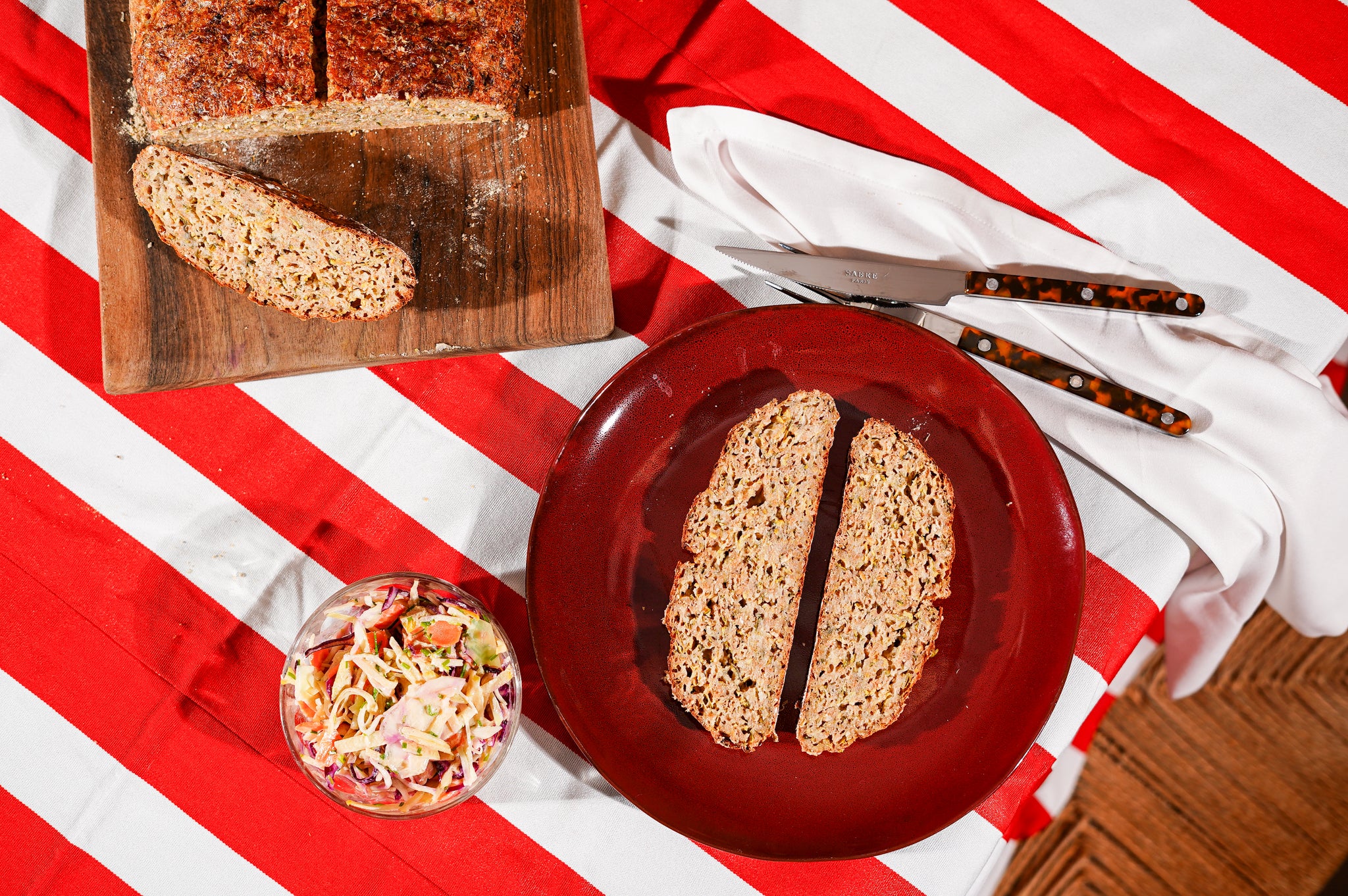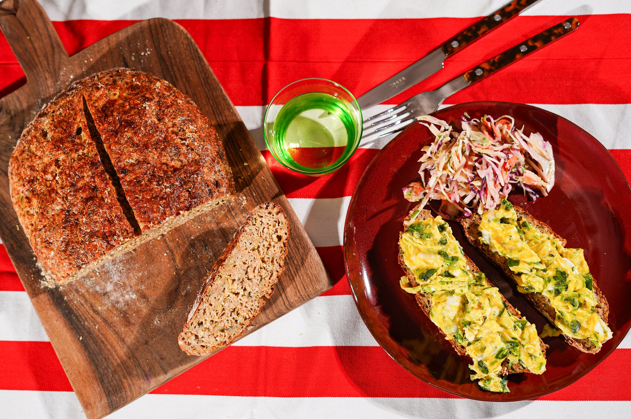Zucchini bread with scrambled eggs and healthy coleslaw