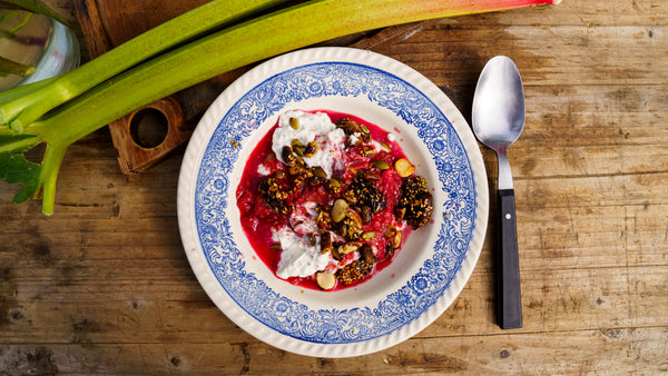 Finishing & servingChoose a glass for a festive touch or a beautiful plate for a cozy start to your day. Start with a layer of orange-chia-yogurt, spoon the fresh rhubarb-raspberry compote on top and finish with a generous scoop of the date crumble. If desired, finish with a few leaves of fresh mint - and done!