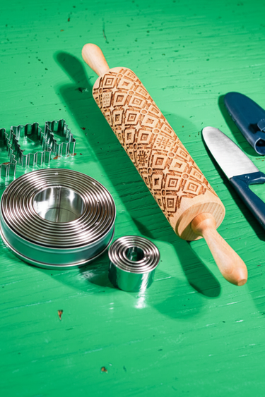 This set is made for young bakers who like to take charge. With a sturdy rolling pin with a cool pattern, a safe kids' knife, a set of rectangular cookie cutters in petit beurre style, and a round cutter set in various sizes, they can really get creative.